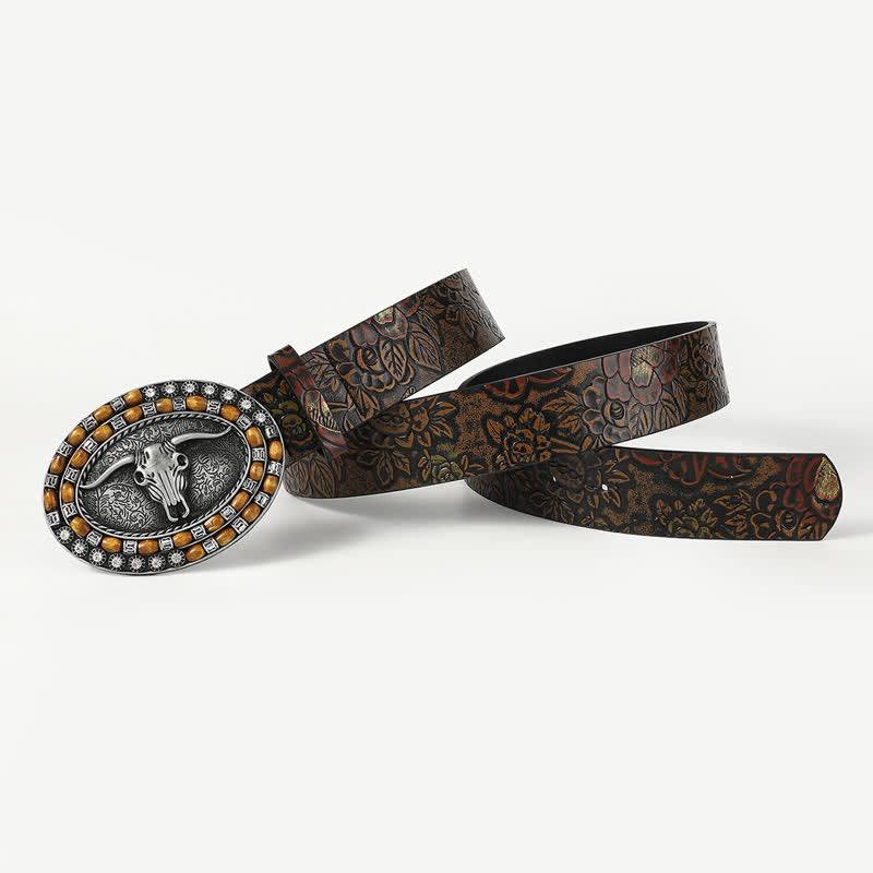 Cinturón de cuero con cabeza de toro tallada con cuentas de madera para hombre
