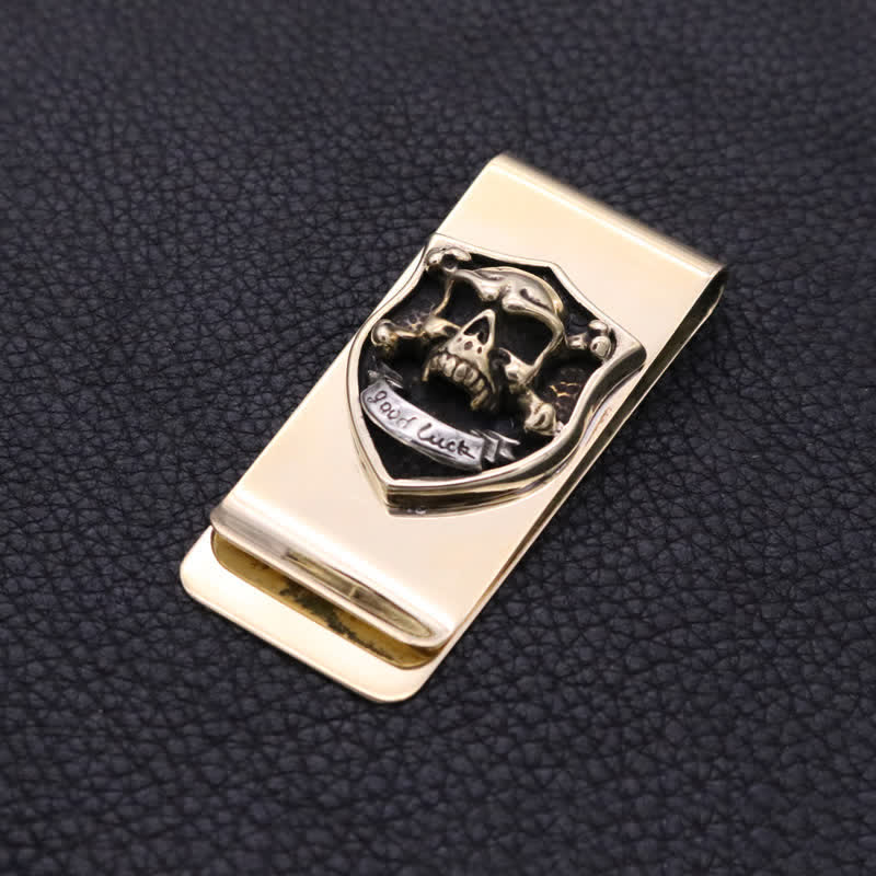 Clip para billetes de latón con forma de calavera en 3D y la buena suerte