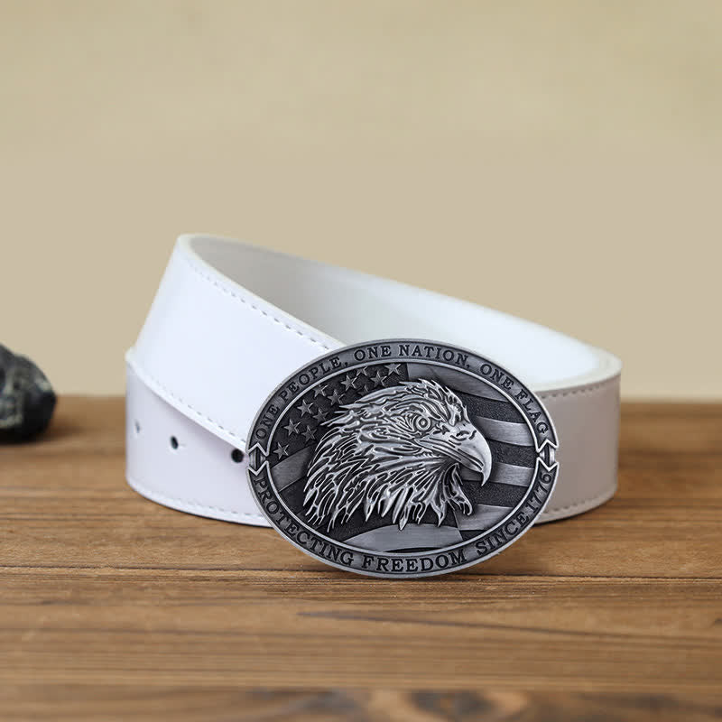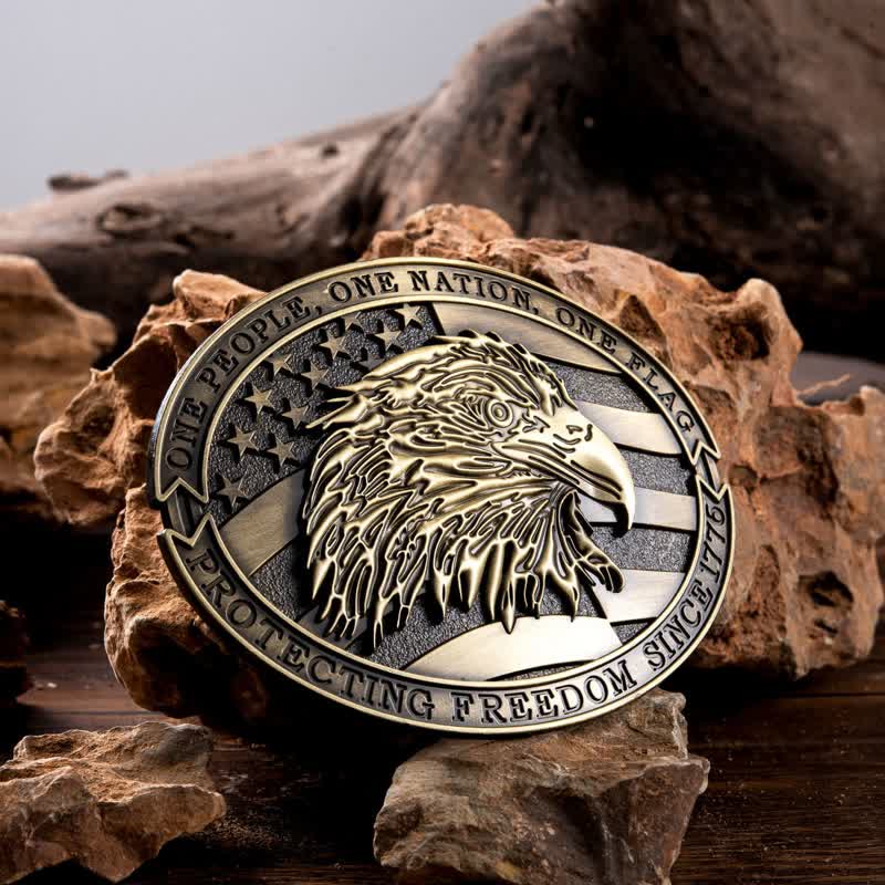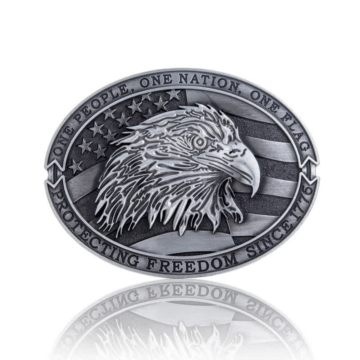 Esta hebilla de cinturón de forma ovalada tiene dos cintas patrióticas inscritas, una en la parte superior y otra en la inferior: “Un pueblo, una nación, una bandera” y también “Protegiendo la libertad desde 1776”. El fondo es la bandera estadounidense con un logotipo central del símbolo estadounidense de la libertad: el águila calva.