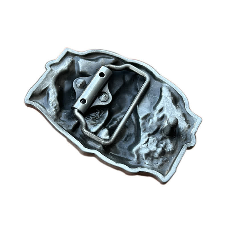Esta hebilla de cinturón presenta un lobo aullando a la luna y una cabeza de lobo a la derecha. Esta hebilla de cinturón de peltre finamente esculpida y esmaltada contiene detalles excepcionales en 3D.