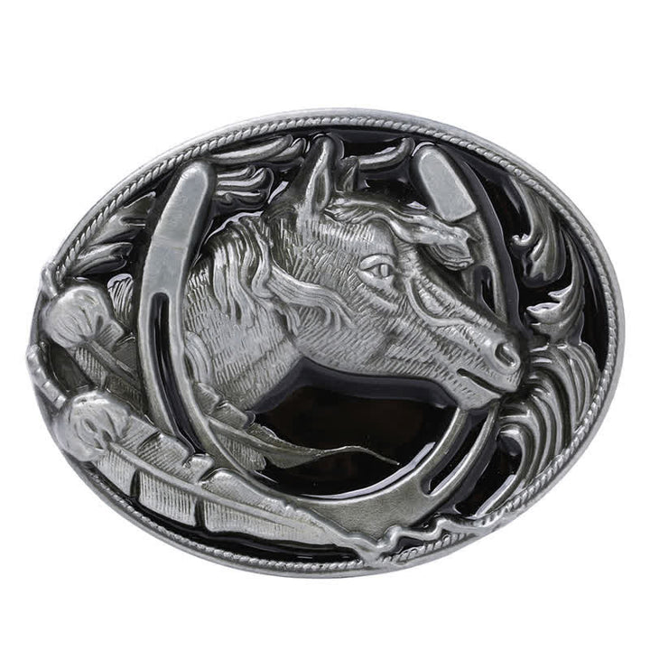 Elaborada en un tono plata antiguo, esta hebilla presenta un motivo de herradura y esmalte negro, lo que la hace única y retro.