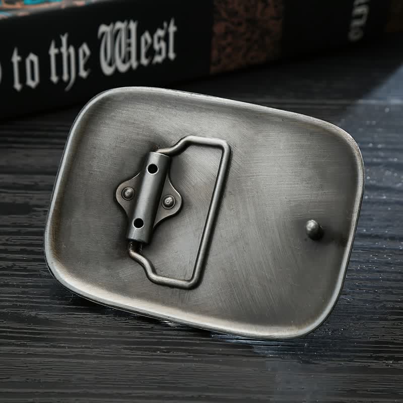 Esta hebilla de cinturón presenta una forma de rectángulo redondeado con un diseño detallado de inspiración bohemia, acentuado con una hermosa piedra turquesa simulada en el centro.