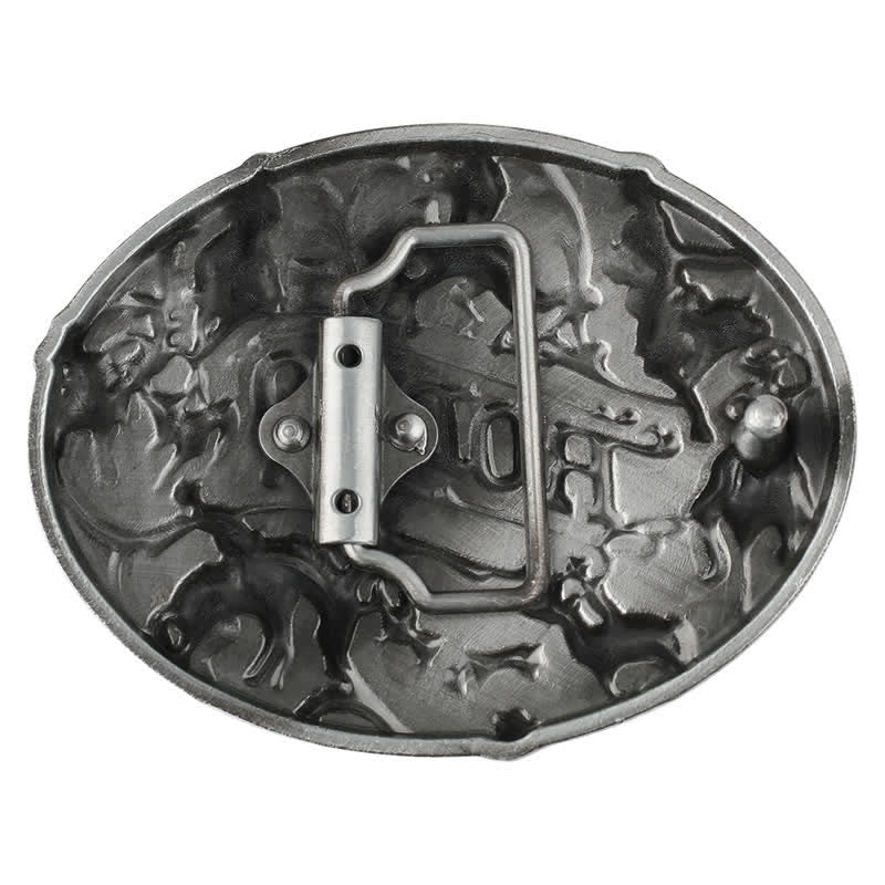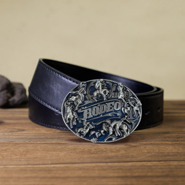 Esta hebilla de cinturón rinde homenaje al rodeo con la palabra "Rodeo" escrita en negrita en el centro y representaciones de los siete eventos del rodeo que la rodean con un borde de cuerda. La hebilla está realzada con esmalte azul.