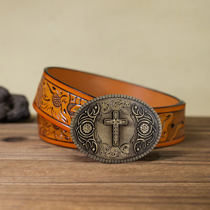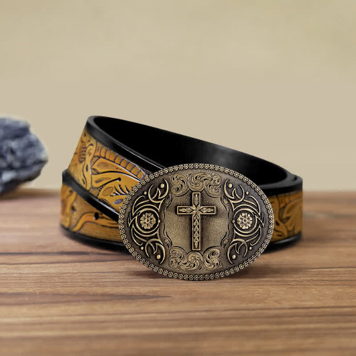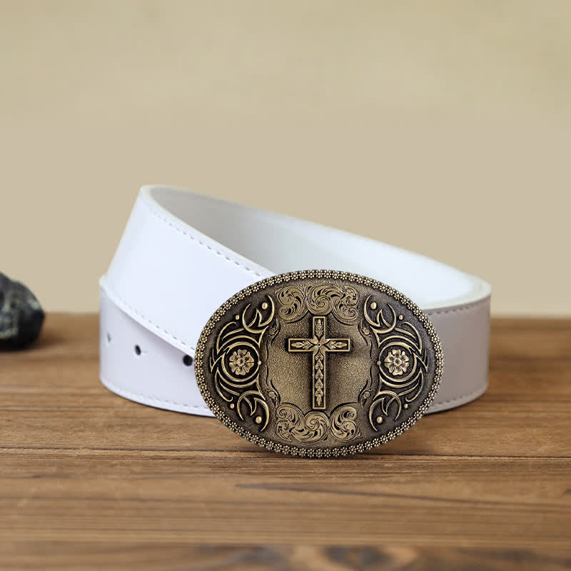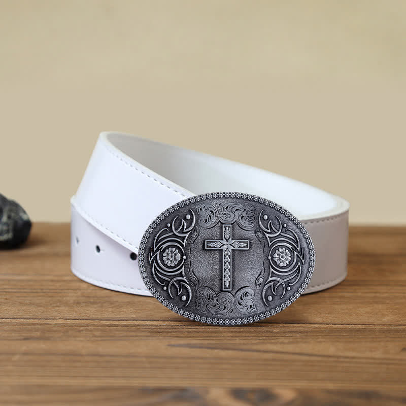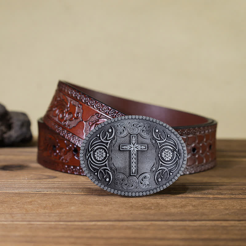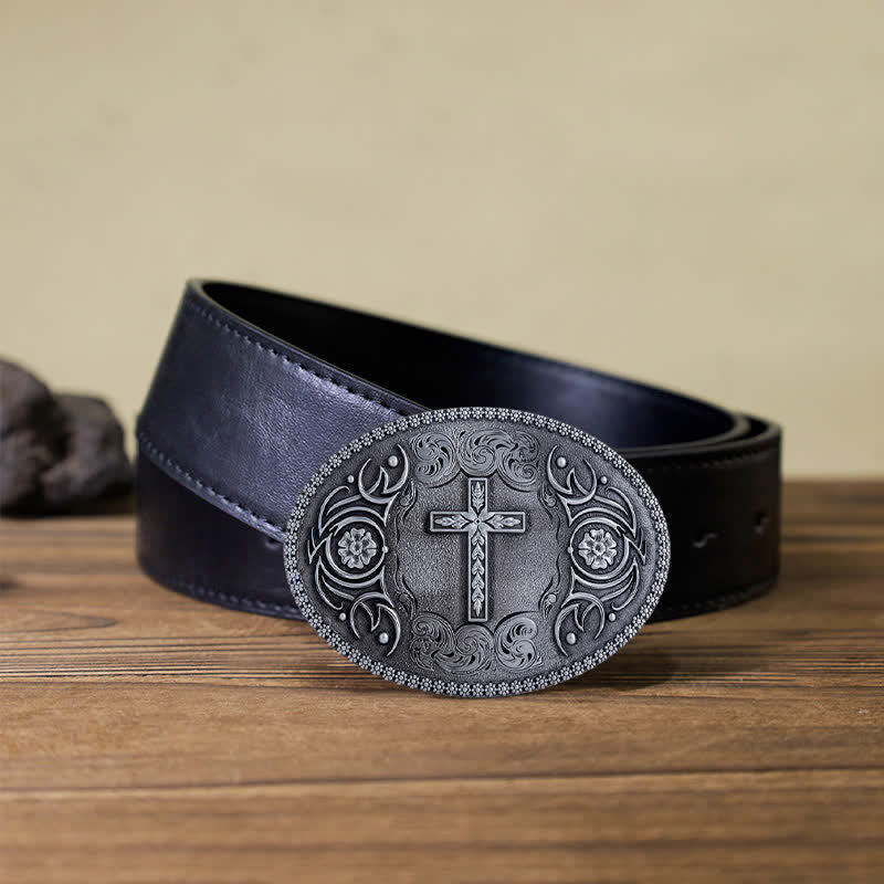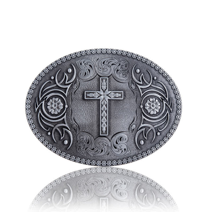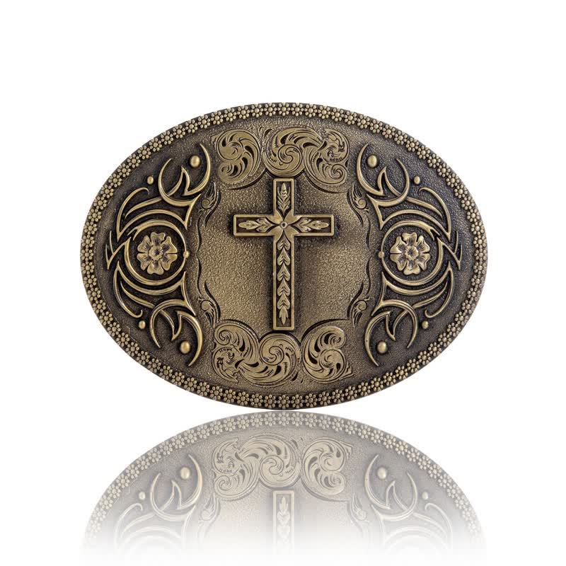 Agregue un toque distintivo a su cinturón favorito con esta hebilla distintiva. Acabado antiguo con una cruz detallada y un fondo floral. Una manera perfecta de mostrar su fe.