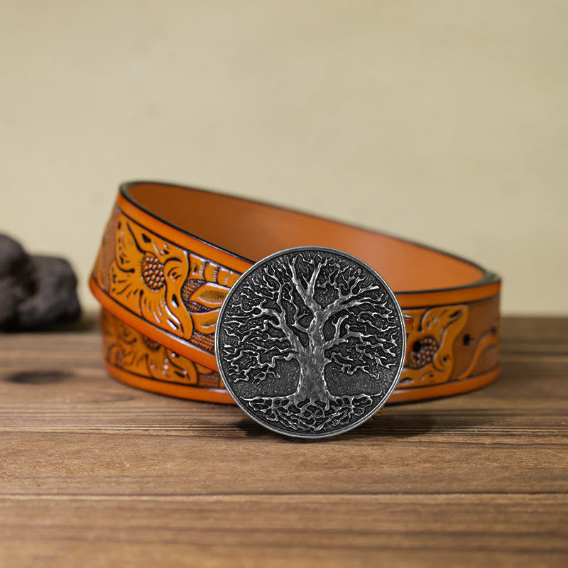 Cinturón de cuero con hebilla redonda del árbol de la vida para hombre, hecho a mano