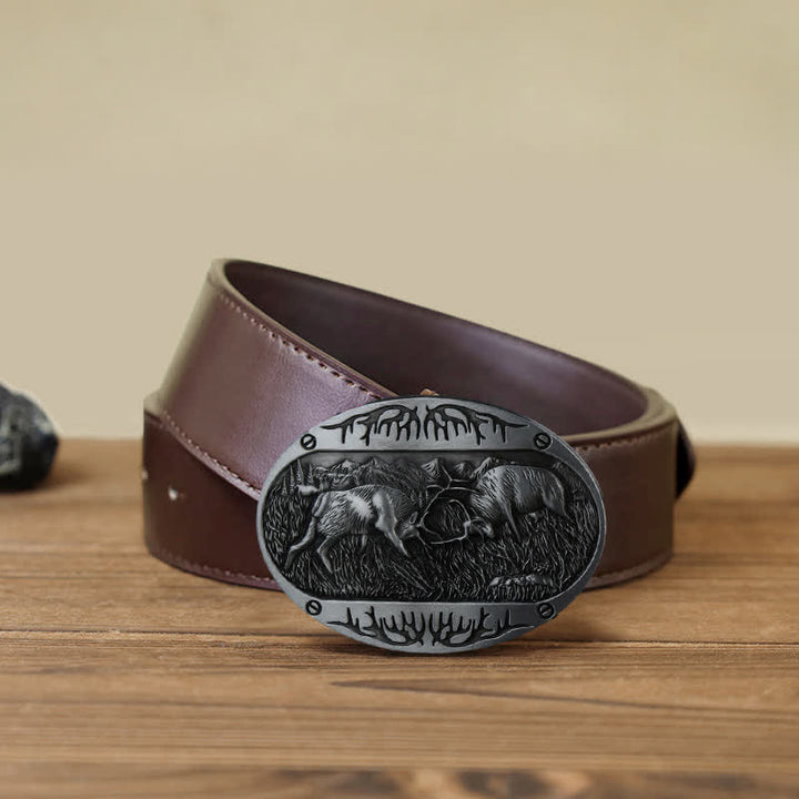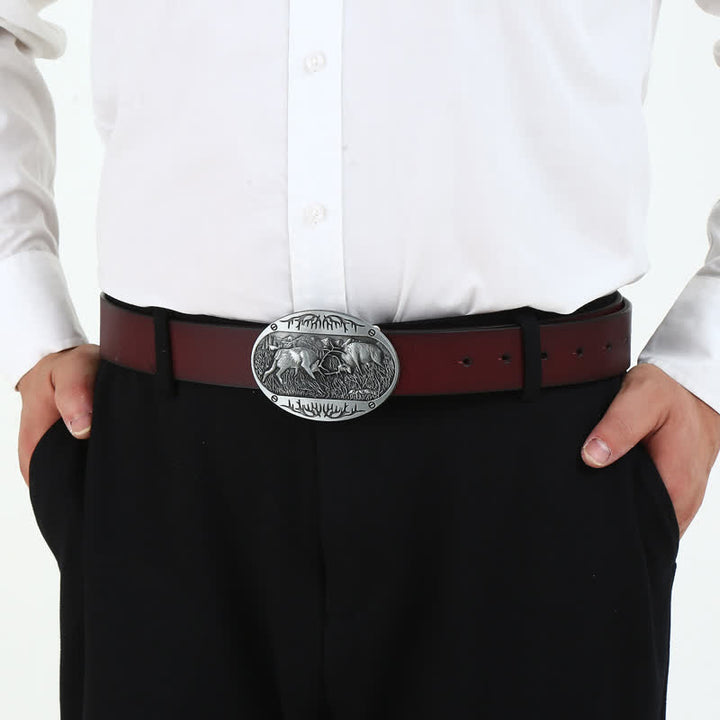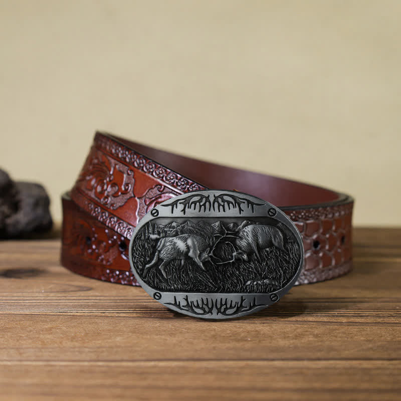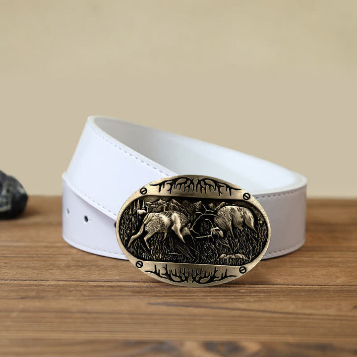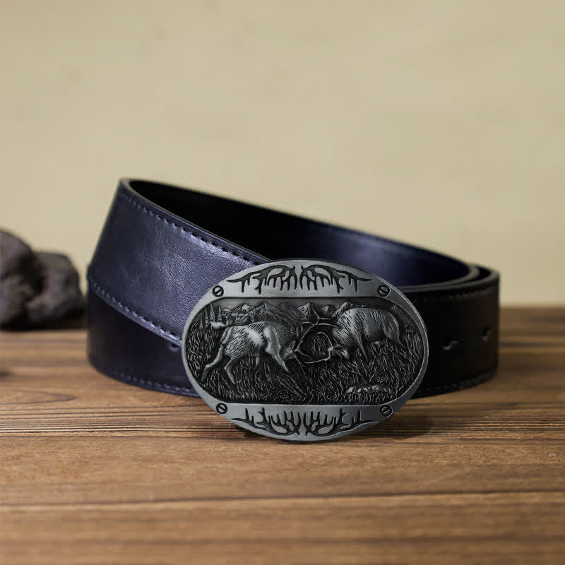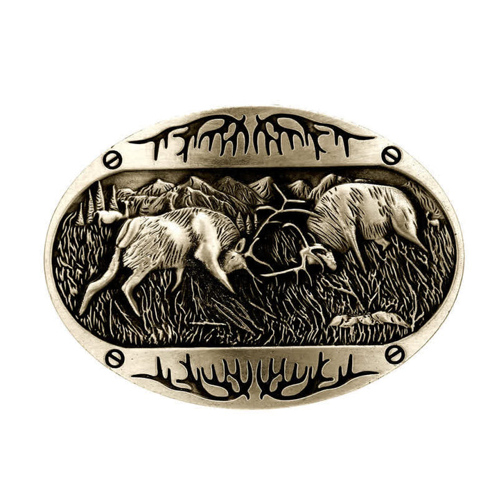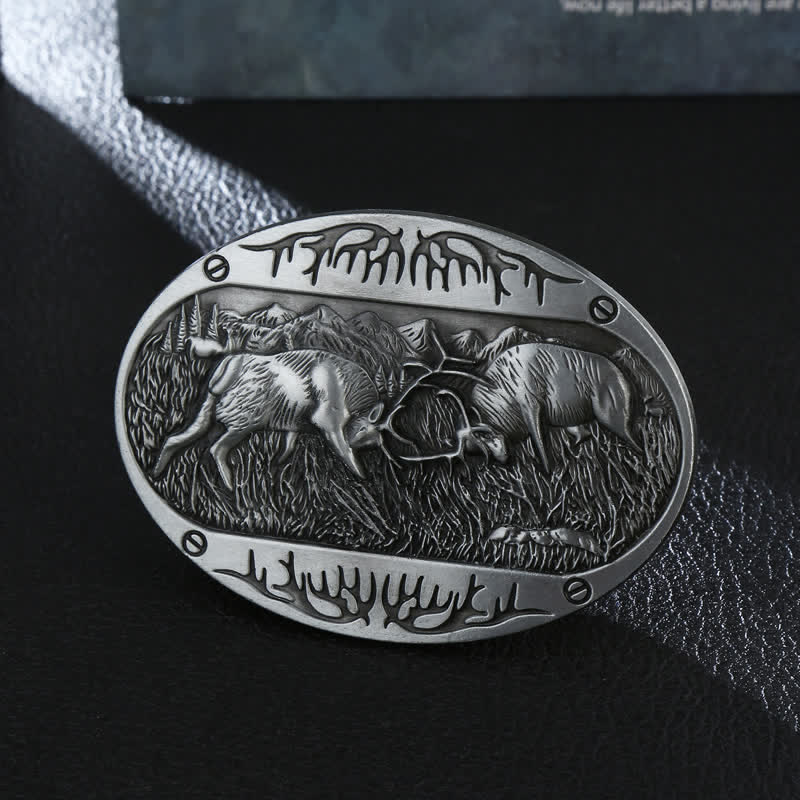 Hebilla ovalada con diseños de ciervos y astas en la parte superior e inferior. Esta hebilla se adapta bien a sus cinturones. Ligera y sencilla, la hebilla ovalada de ciervo para cinturón resalta cualquier estilo con un diseño moderno.