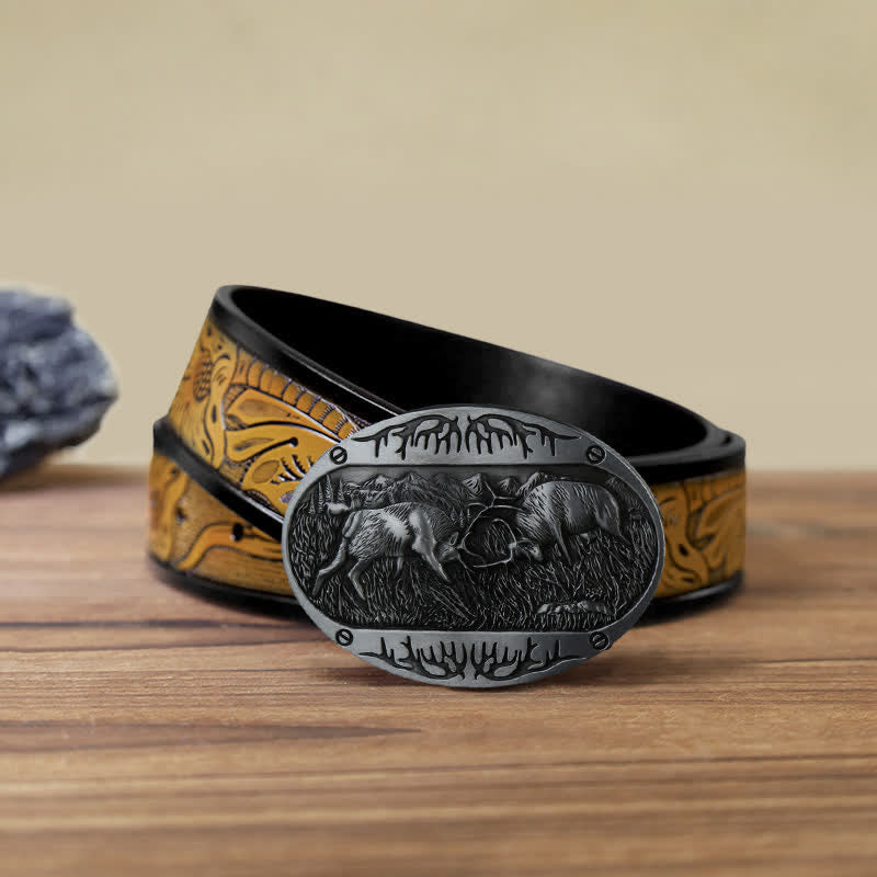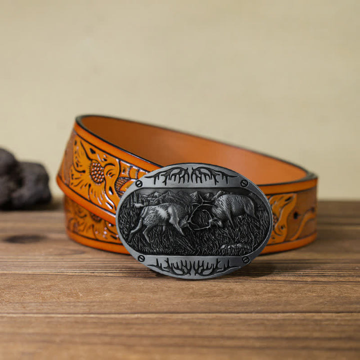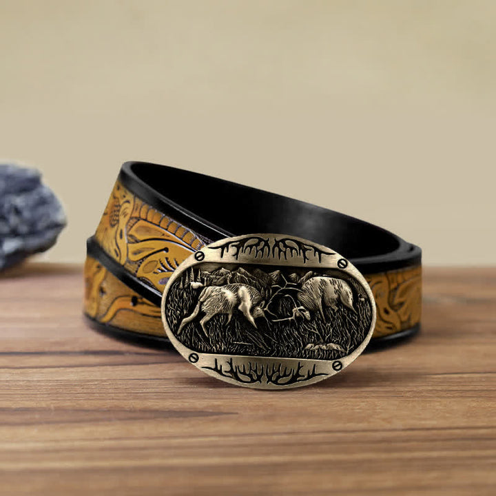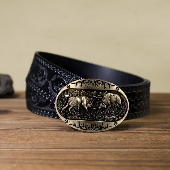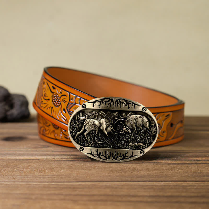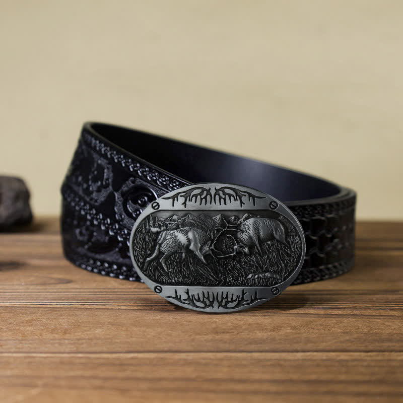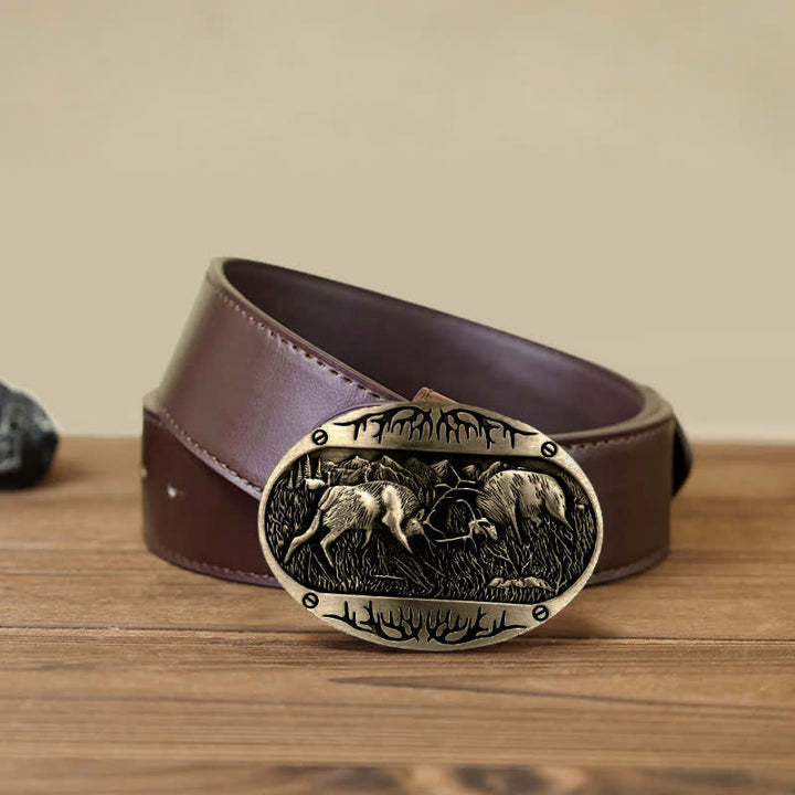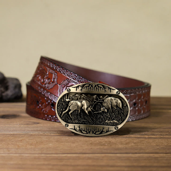 Hebilla ovalada con diseños de ciervos y astas en la parte superior e inferior. Esta hebilla se adapta bien a sus cinturones. Ligera y sencilla, la hebilla ovalada de ciervo para cinturón resalta cualquier estilo con un diseño moderno.