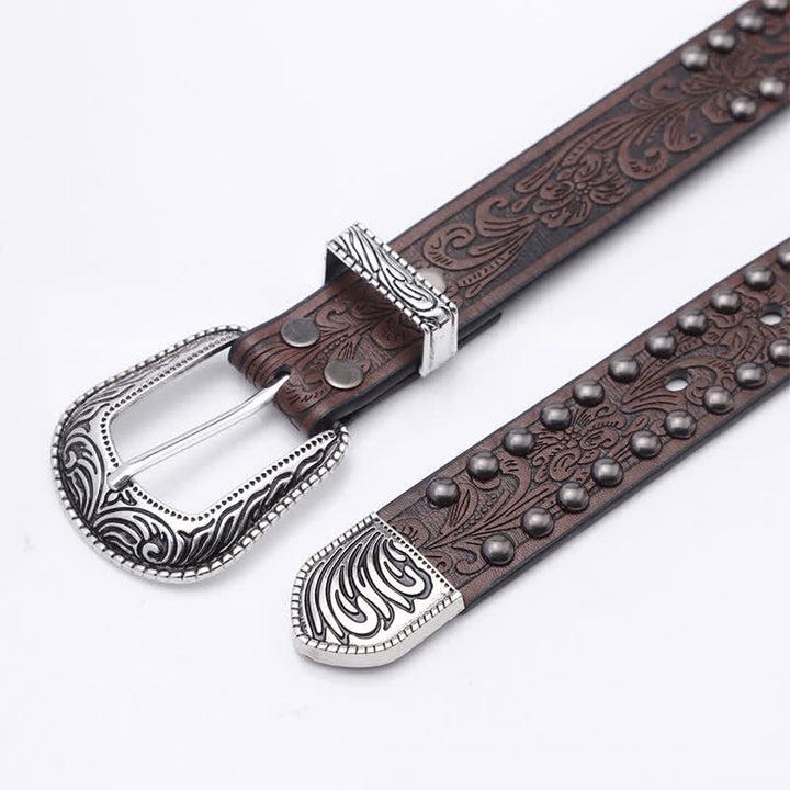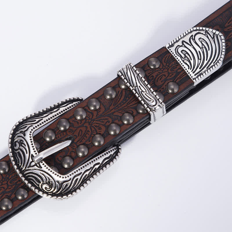 Patrón en relieve y remaches tachonados, combina fácilmente con tu ropa. Terminado con una hebilla plateada con estampado floral adornado. Muestra tu estilo atrevido cuando uses este cinturón marrón a cuadros.