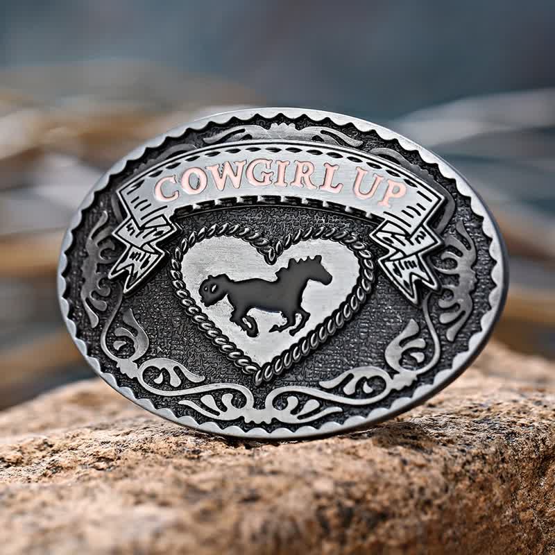 Plata oscura con detalle floral, un corazón detallado con la silueta de un caballo y un cartel en rosa que dice COWGIRL UP. Muestra tu corazón western y tu dureza con esta hebilla.