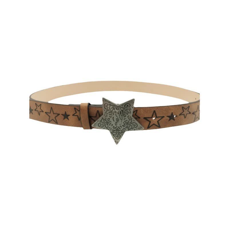 Haz una declaración con este cinturón con diseño de estrellas. Su decoración de estrellas y su color neutro lo convierten en una pieza destacada que añade personalidad a tu atuendo. Combínalo con jeans, faldas y vestidos para un look moderno.