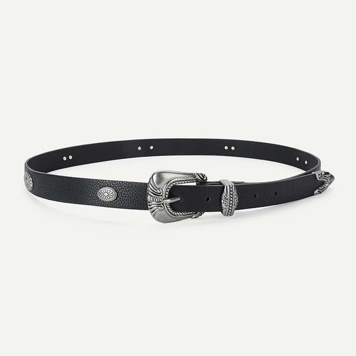 Este cinturón le agrega un toque moderno a tu par de jeans o pantalones favoritos. Con una hebilla ornamentada y remaches de concho tachonados en el elegante cinturón, este estilo elegante complementa cualquier atuendo a la perfección.