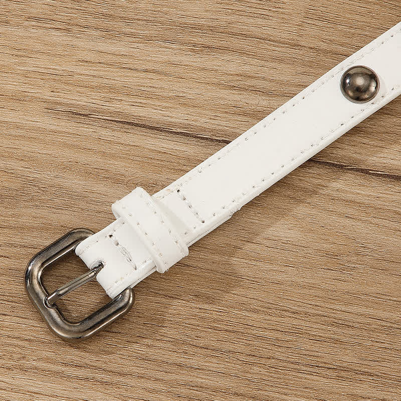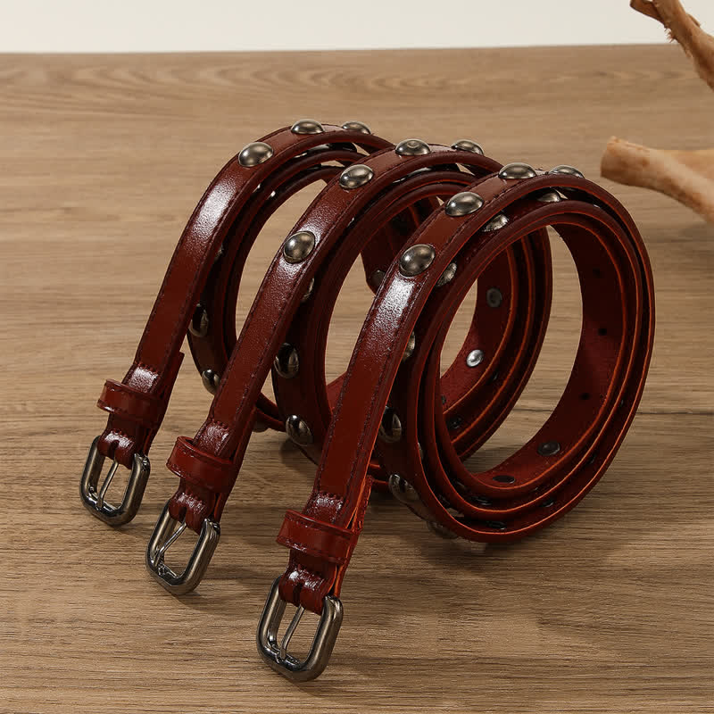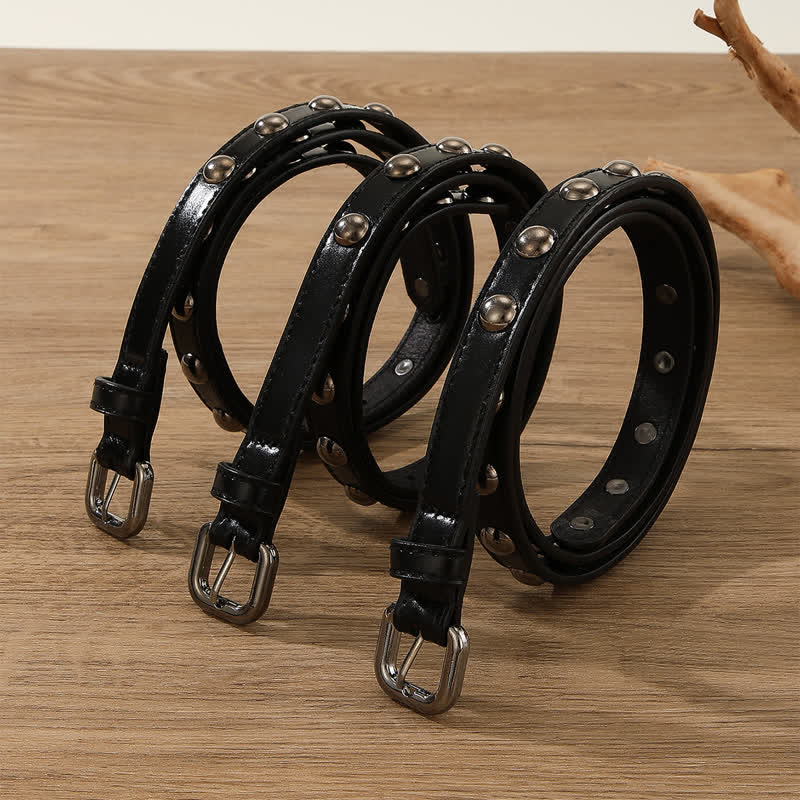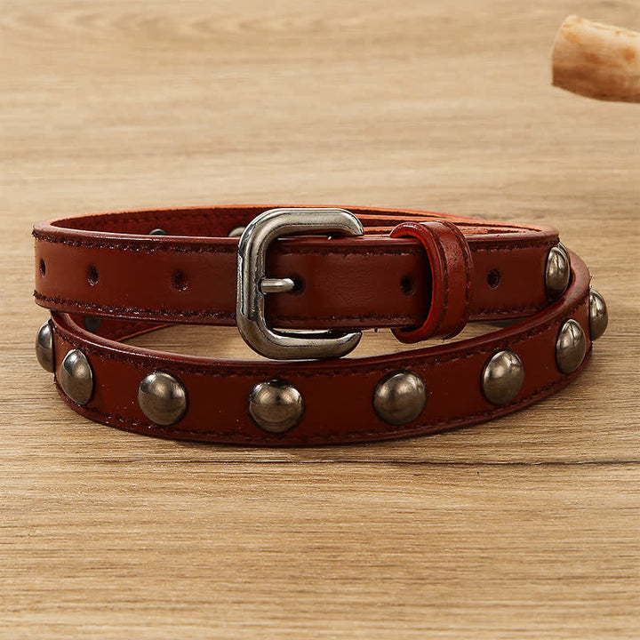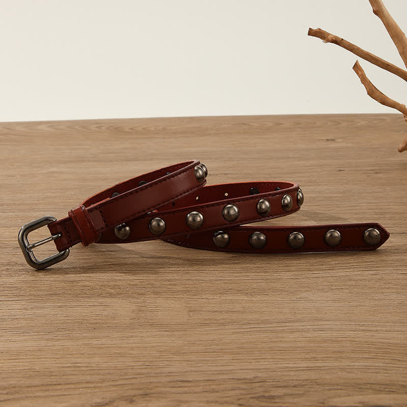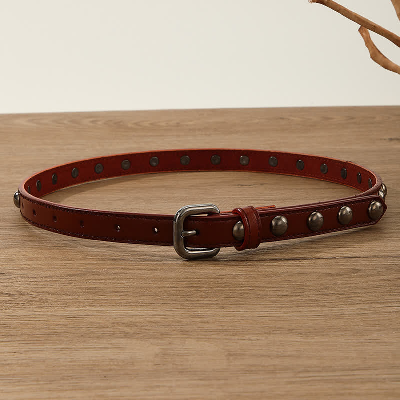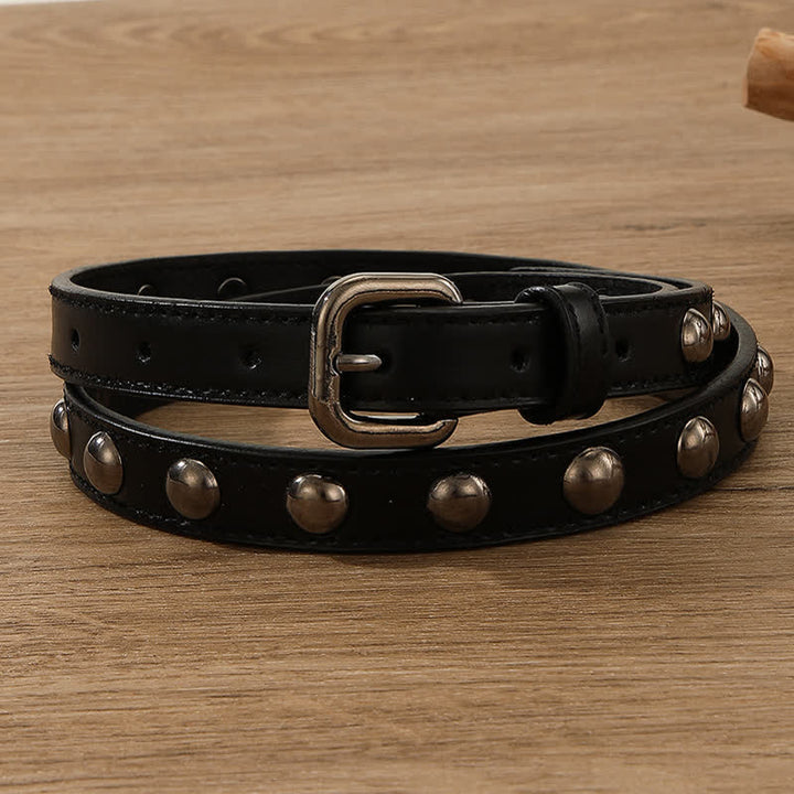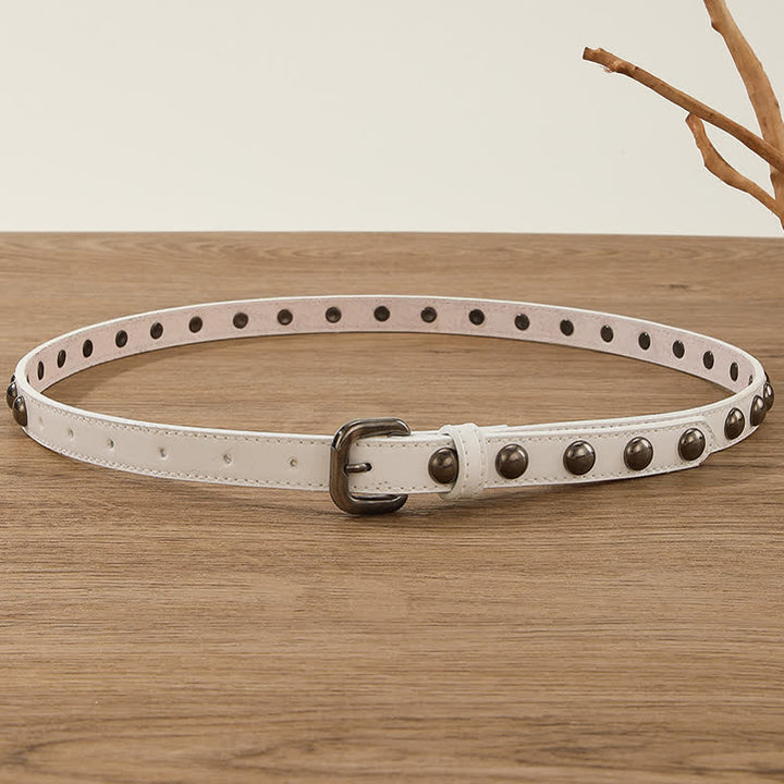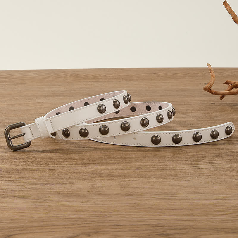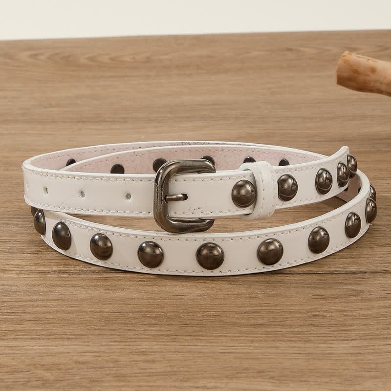 Los remaches de cuentas redondas de bronce, clásicos y sencillos, no pasarán de moda. Este moderno cinturón punk está equipado con una hebilla de metal continua.