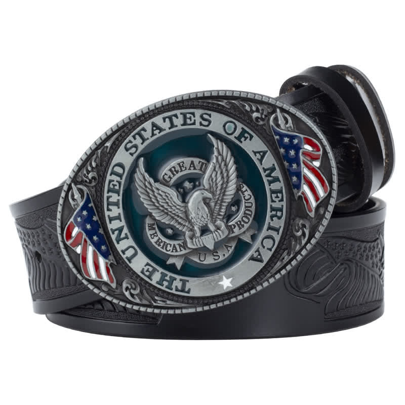 Presenta un águila desplegada, banderas estadounidenses y el sello ESTADOS UNIDOS DE AMÉRICA. El cinturón presenta un diseño elegante y atemporal que complementa sin esfuerzo cualquier atuendo. Su apariencia elegante y estilizada agrega un toque de sofisticación a su conjunto.