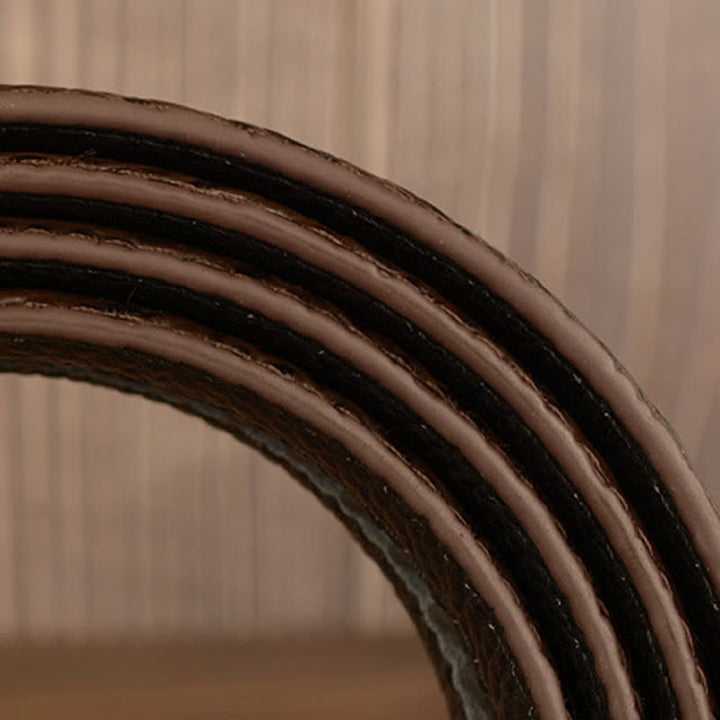- Simplemente deslice el cinturón de vestir en la hebilla deslizante y tire del cinturón de cuero; la hebilla de trinquete se bloquea automáticamente.